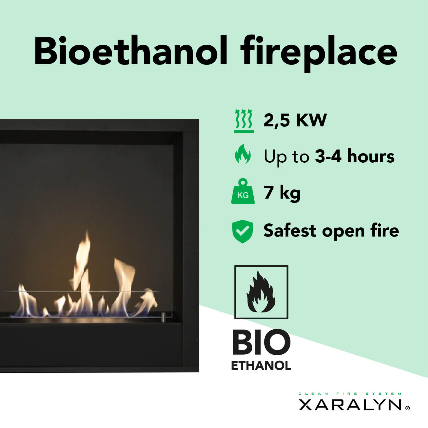 Xaralyn Inbouwunit M inbouwhaard. Kleine bio-ethanol sfeerhaard voor gebruik in een woonkamer zonder rookgasafvoer of schoorsteen. Schone en veilige verbranding met een gepatenteerde keramische bio-ethanol brander.