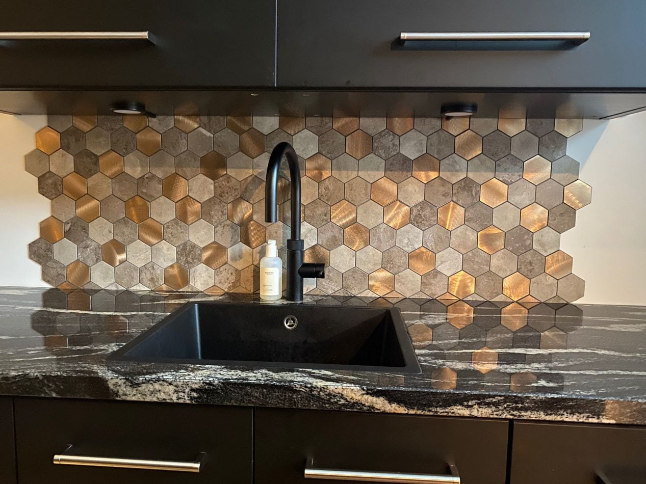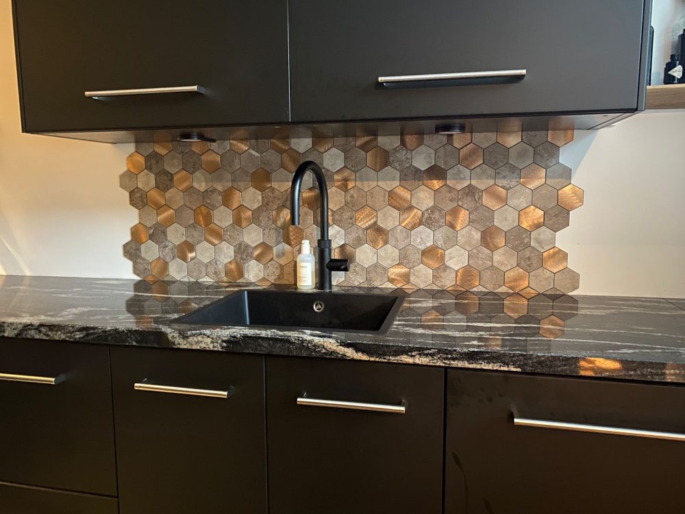 Hexagon Steenstrips met aan de achterkant een sterke 3M kleeflaag. Ideaal om direct over oude tegels te plakken. Voor kalk(verf) muren of grovere oppervlakten adviseren wij extra montagekit toe te voegen.
