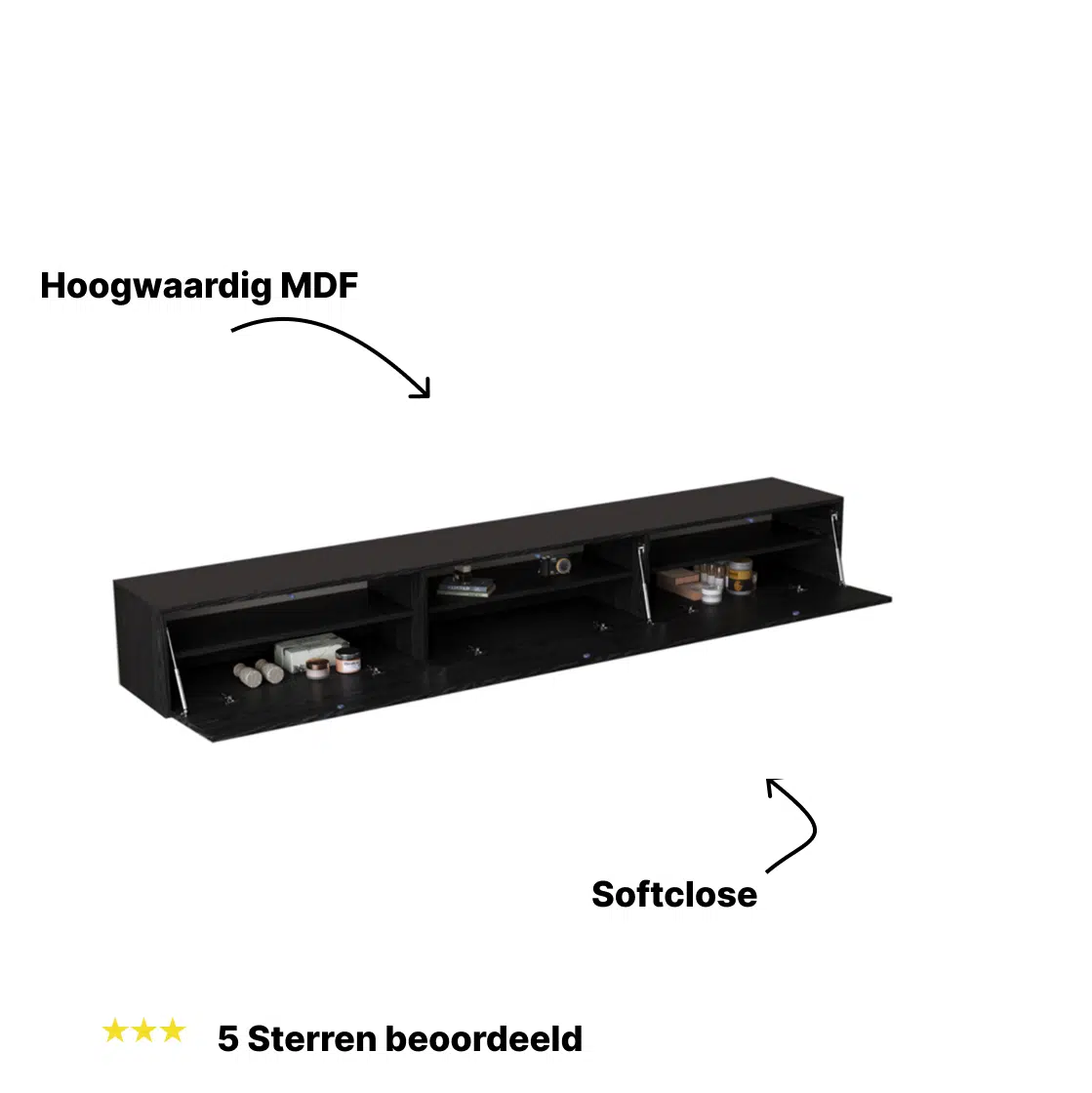 Breng rust, luxe en stijl in je woonkamer met dit minimalistische zwevende TV-meubel in Zwart Eiken Look.